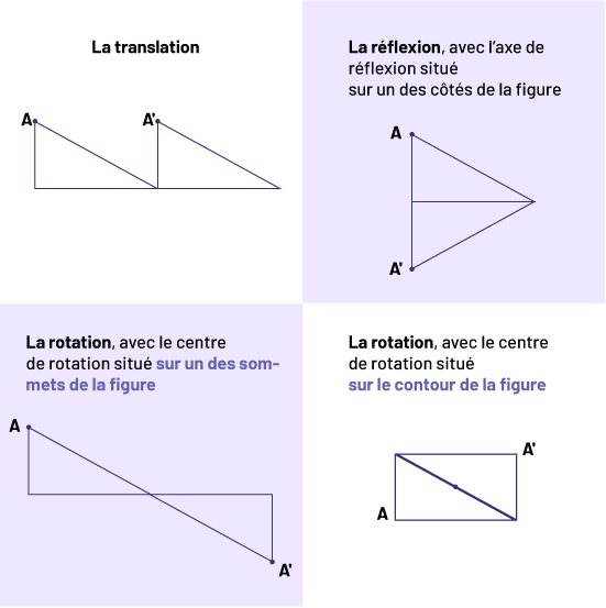 Au besoin, revoir les quatre transformations décrites ci-dessous. S’assurer notamment que les élèves sont capables d’effectuer une rotation lorsque le centre de rotation est situé sur le contour d’une figure.