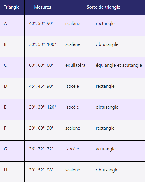 degrés, 50 degrés, 90 degrés, triangle scalène rectangle.Triangle « B », 30 degrés, 50 degrés,